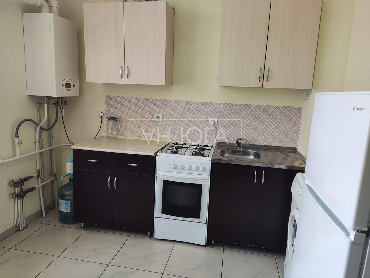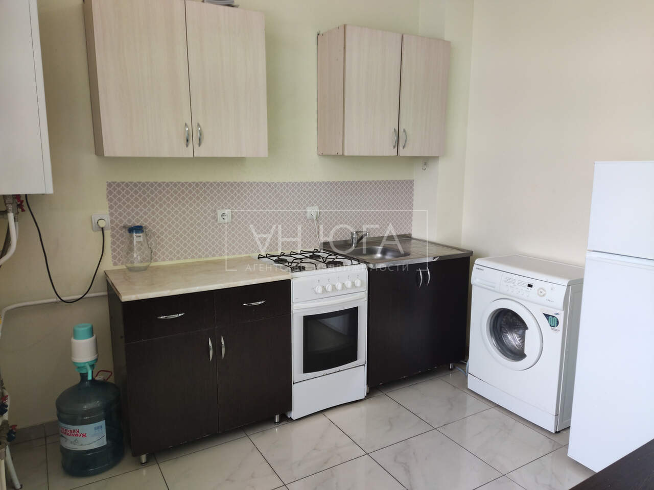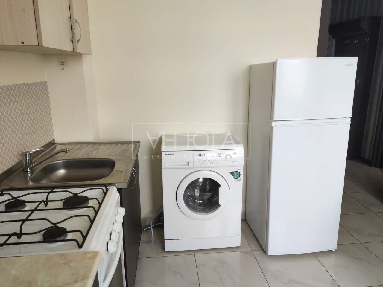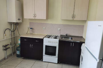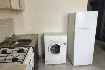 Квартира полностью укомплектована мебелью и техникой: кухонный гарнитур, холодильник, стиральная машинка, чайник, телевизор, двухспальная кровать, вместительный шкаф.